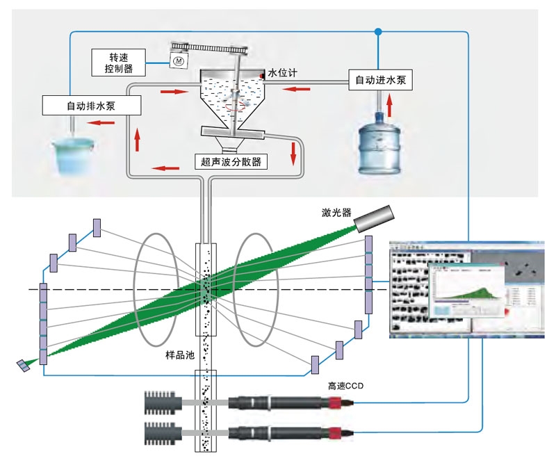 显微图像系统 | 进口高速 CCD 配置 白光面光源+LED 蓝光点光源 镜头倍数 0.5x 和 10x 图像识别速率 120 帧/秒 最大颗粒识别速度 10000 个/分钟 包括长径比、圆形度、最大粒径等 20 个参数 |